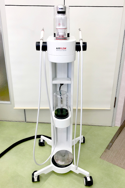 エアーフローは、細かい粉状のエアーフローパウダーをジェット水流で歯に直接吹きつけて、歯肉縁上・縁下のバイオフィルム、ステイン、早期歯石などを快適かつ効率的に除去することができます。