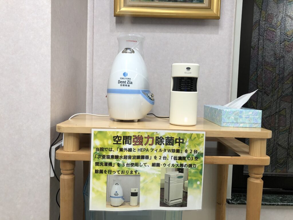 当院では従来よりスタンダードプリコーション(標準予防策)を行っておりますが、新型コロナウイルス(COVID-19)感染対策の為、1時間ごとに高頻度接触環境表面(HTS=Highーtouch surfaces)の消毒を酸化電解水(次亜塩素酸水)で行うなど、より一層予防策を強化しております。