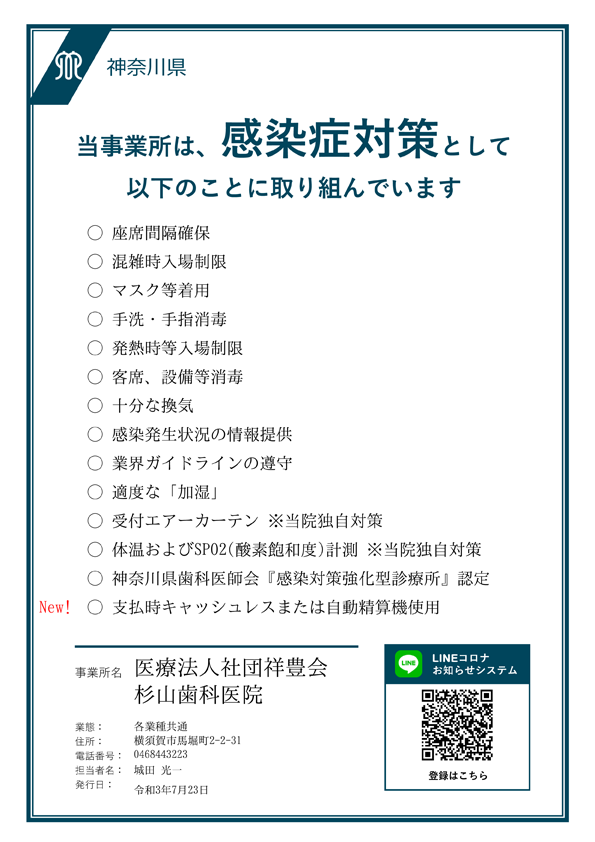 ☆当院は、神奈川県の感染防止対策取組及びLINEコロナお知らせシステム、日本歯科医師会「安心マーク」に登録しております。