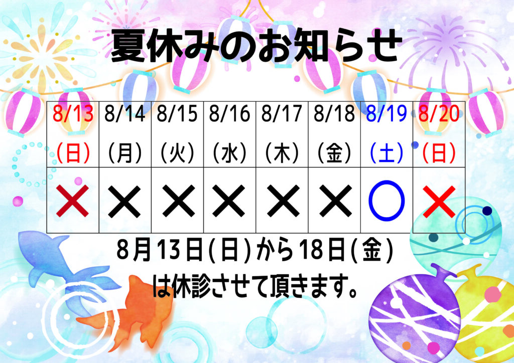 8月13日(日)から8月18日(金)は夏休みとさせて頂きます。