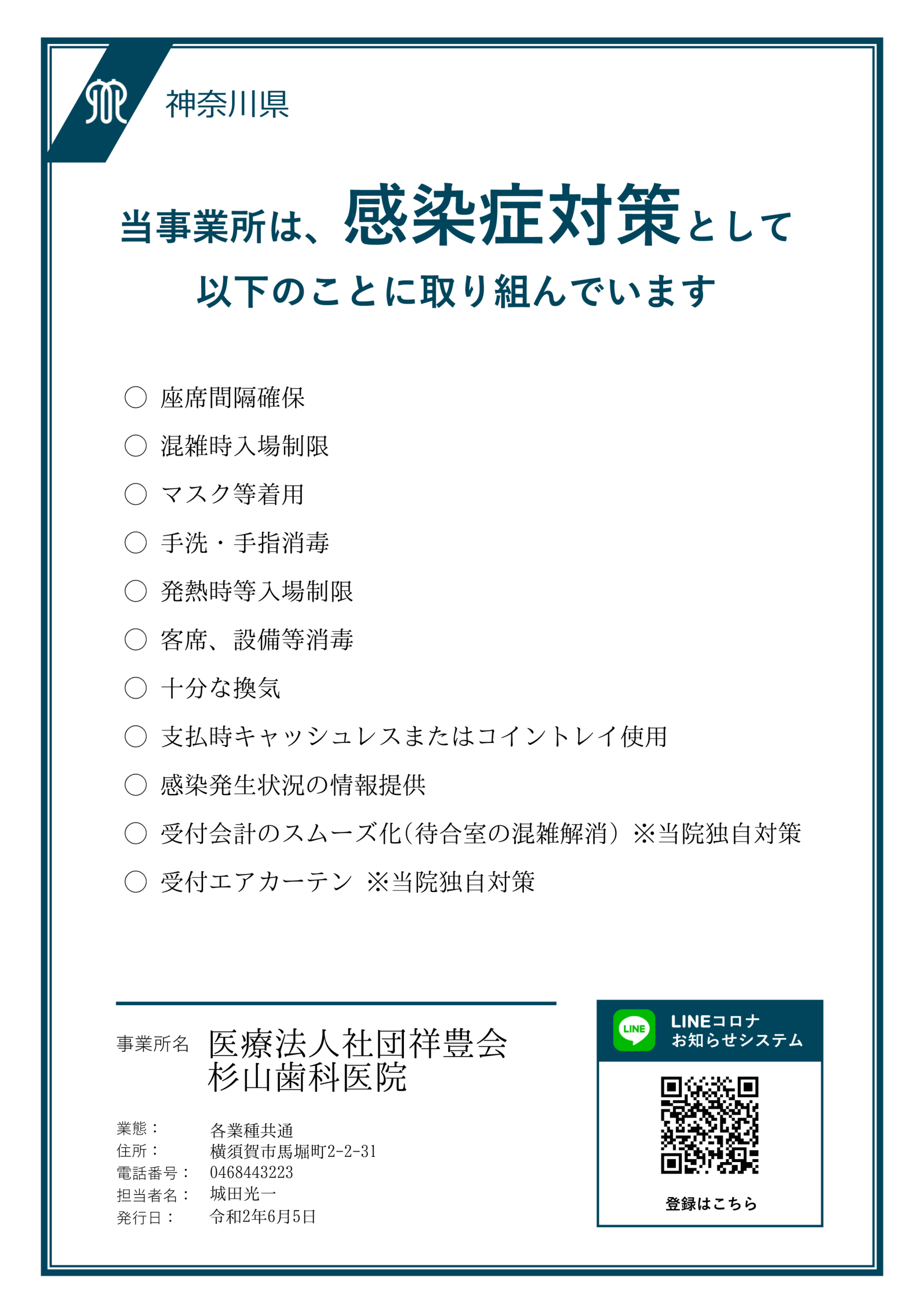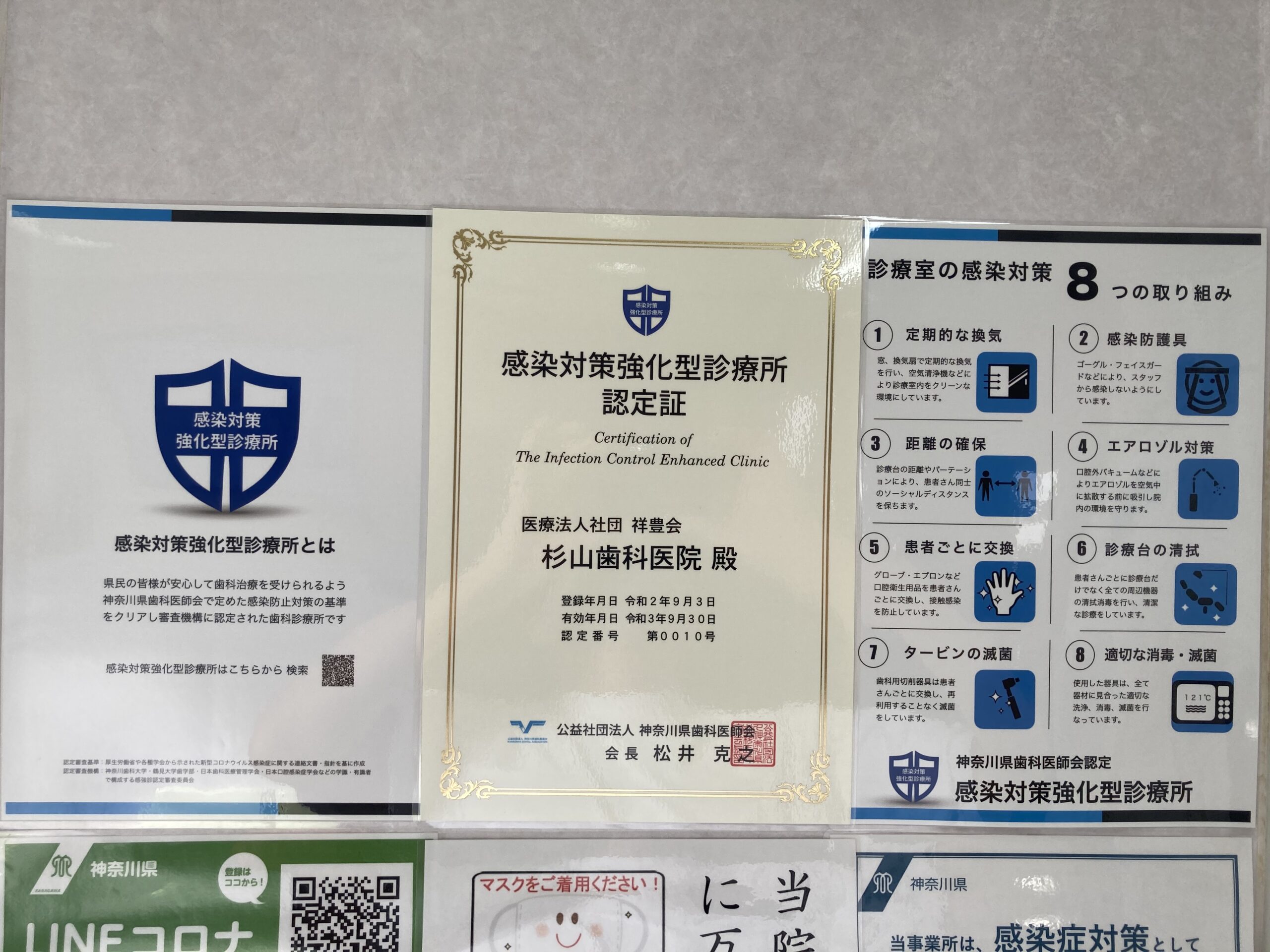 待合室に新しい空気清浄機 《AirdogX5s》を導入しました! 2020/12/05 待合室に新しい空気清浄機《AirdogX5s》を導入しました! コロナウイルスの6分の1の大きさの、0.0146μmの微 […] 続きを読む 『感染対策強化型診療所』の認定を受けました。 2020/09/03 公益社団法人 神奈川県歯科医師会より、『感染対策強化型診療所』の認定を受けました。 県民への安全な歯科医療の提供と共に、 […] 続きを読む 新型コロナウイルス(COVID-19)の対策について 2020/08/19 当院では従来よりスタンダードプリコーション(標準予防策)を行っておりますが、新型コロナウイルス(COVID-19)感染対 […] 続きを読む 歯科治療や検診を自粛されている皆様へ 2020/05/27 今の杉山歯科医院は、 混雑対策①予約はDr1人につき1枠 混雑対策②会計はスムーズに!※診療後に診察室で予約を取り、その […] 続きを読む 新型コロナウイルス(COVID-19)の対策について 2020/05/26 当院では従来よりスタンダードプリコーション(標準予防策)を行っておりますが、新型コロナウイルス(COVID-19)感染対 […] 続きを読む 新型コロナウイルス(COVID-19)の対策について③ 2020/04/27 当院では従来よりスタンダードプリコーション(標準予防策)を行っておりますが、新型コロナウイルス(COVID-19)感染対 […] 続きを読む ゴールデンウィーク中の診療のお知らせ 2020/04/14 5月4日(月)と5日(火)は休診とさせて頂きます。6日(水)は診療いたします。※診療時間…AM10:00~12:30 P […] 続きを読む 新型コロナウイルス(COVID-19)の対策について② 2020/04/10 当院では従来よりスタンダードプリコーション(標準予防策)を行っておりますが、新型コロナウイルス(COVID-19)感染対 […] 続きを読む 新型コロナウイルス(COVID-19)の対策について 2020/02/25 当院では従来よりスタンダードプリコーション(標準予防策)を行っておりますが、新型コロナウイルス(COVID-19)感染対 […] 続きを読む あけましておめでとうございます。 2020/01/06 あけましておめでとうございます。 杉山歯科医院の2020年の目標は、『患者様のメインテナンス、SPTを充実させよう』とな […] 続きを読む