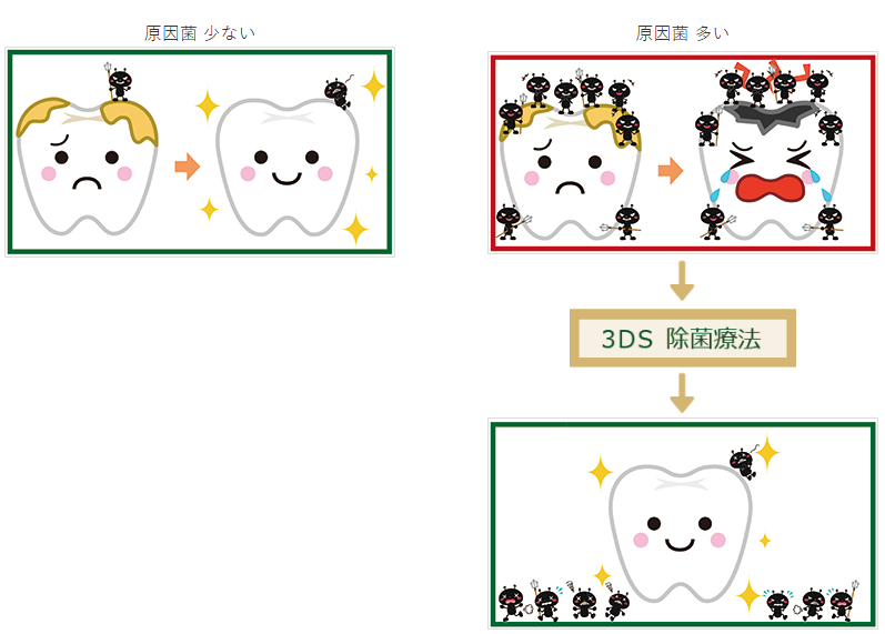 3DS(除菌療法)とは「Dental Drug Delivery System」の4つの頭文字をとった略語で、虫歯や歯周病の原因菌を除菌して虫歯や歯周病のリスクを下げる最新の治療法です。